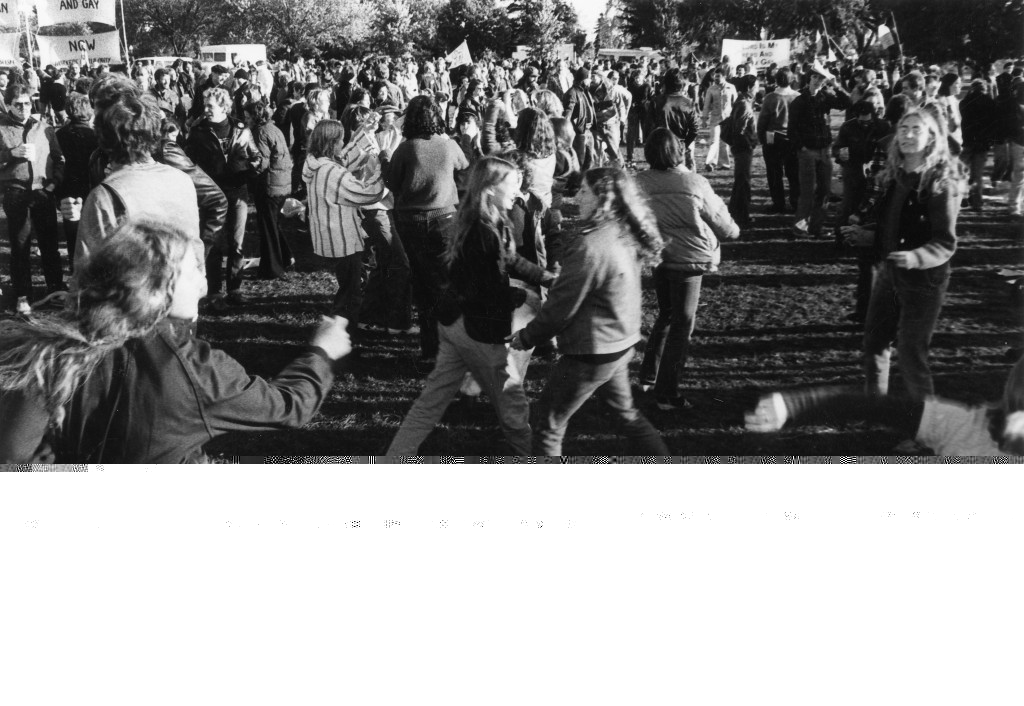 Photograph captures some march participants in positions that would indicate they are dancing. They are dancing in a grassy area amongst a crowd of people at the National March on Washington for Lesbian and Gay Rights.
