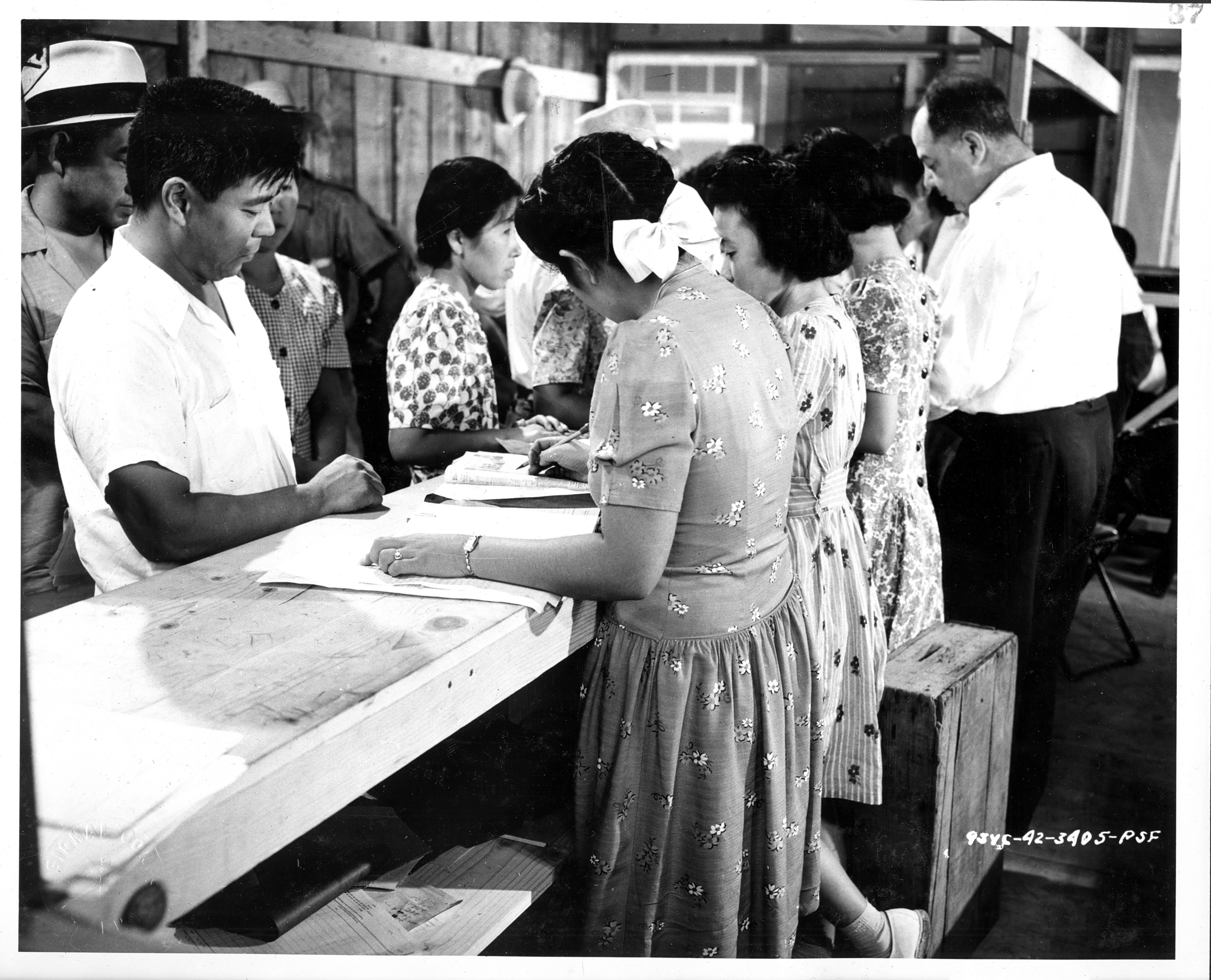 Photograph shows evacuees signing up for clothing issue at Fresno, California Assembly Center.