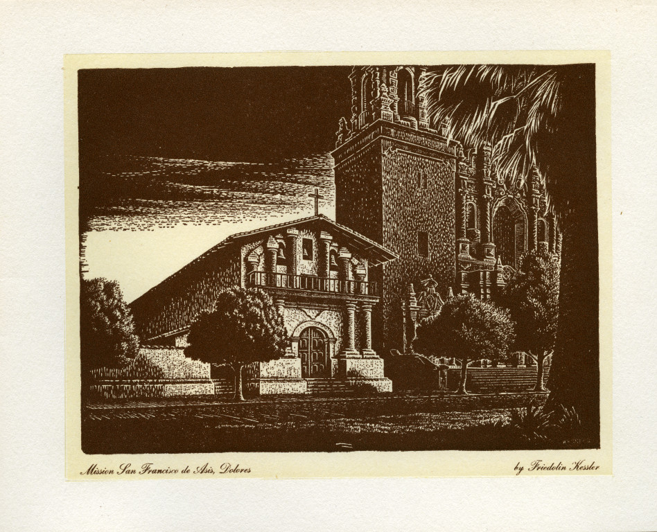 Linoleum cut print of Mission San Francisco de Asis, Dolores on paper, pasted on front of greeting card. In cursive at bottom of card, Mission San Francisco de Asis, Dolores by Friedolin Kessler.