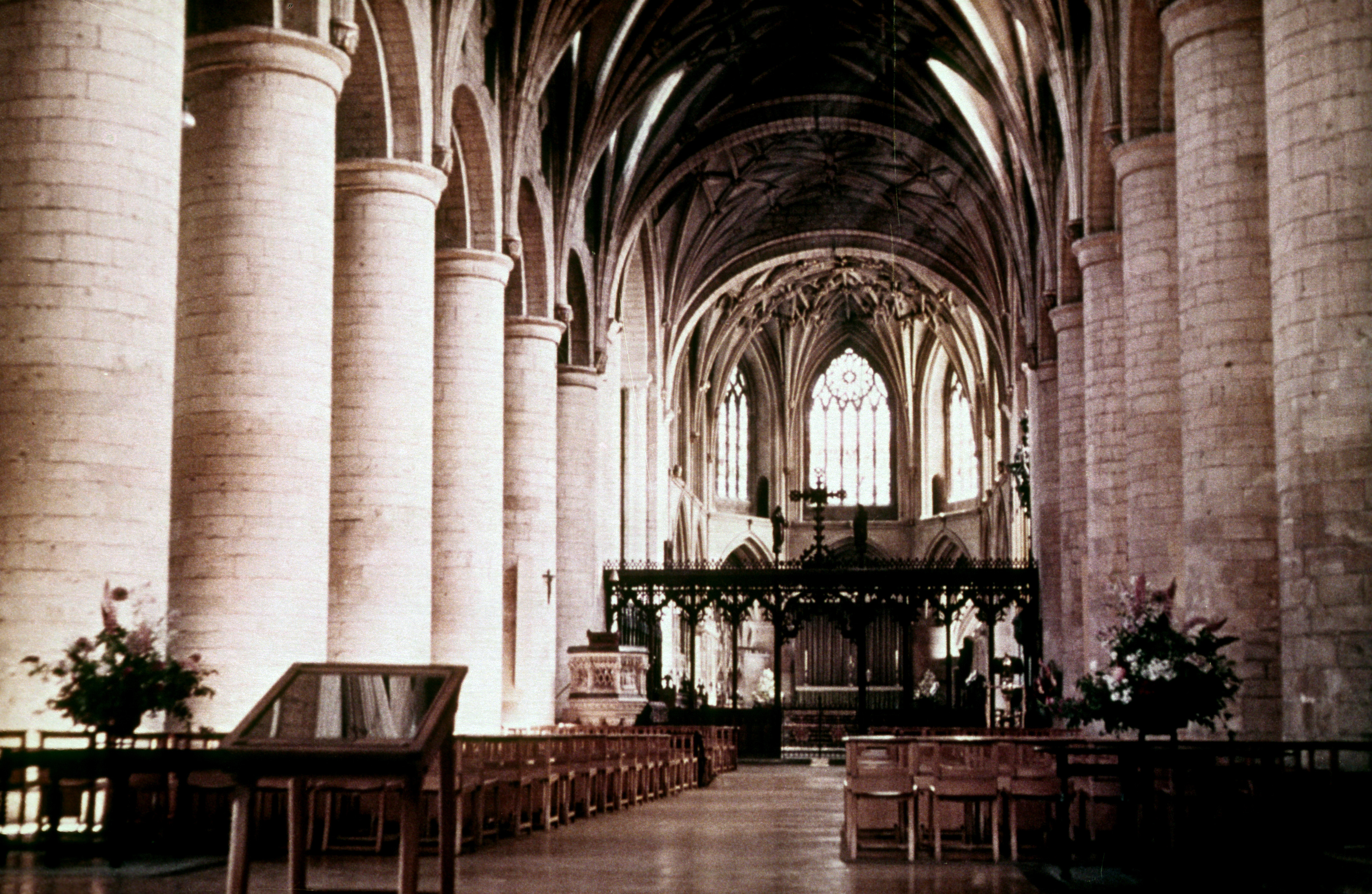 Shaped stone for building this great abbey church, the second largest parish church in England was brought by the sea from Caen in Normandy. Its circular columns and arches are typical, but the roof-which was later vaulted in the fifteenth century-replaced an earlier timber structure. The rapid changeover from the construction of small buildings by local craftsmen out of local materials, to a prototype industrial system was another of the major products of the Norman Conquest.