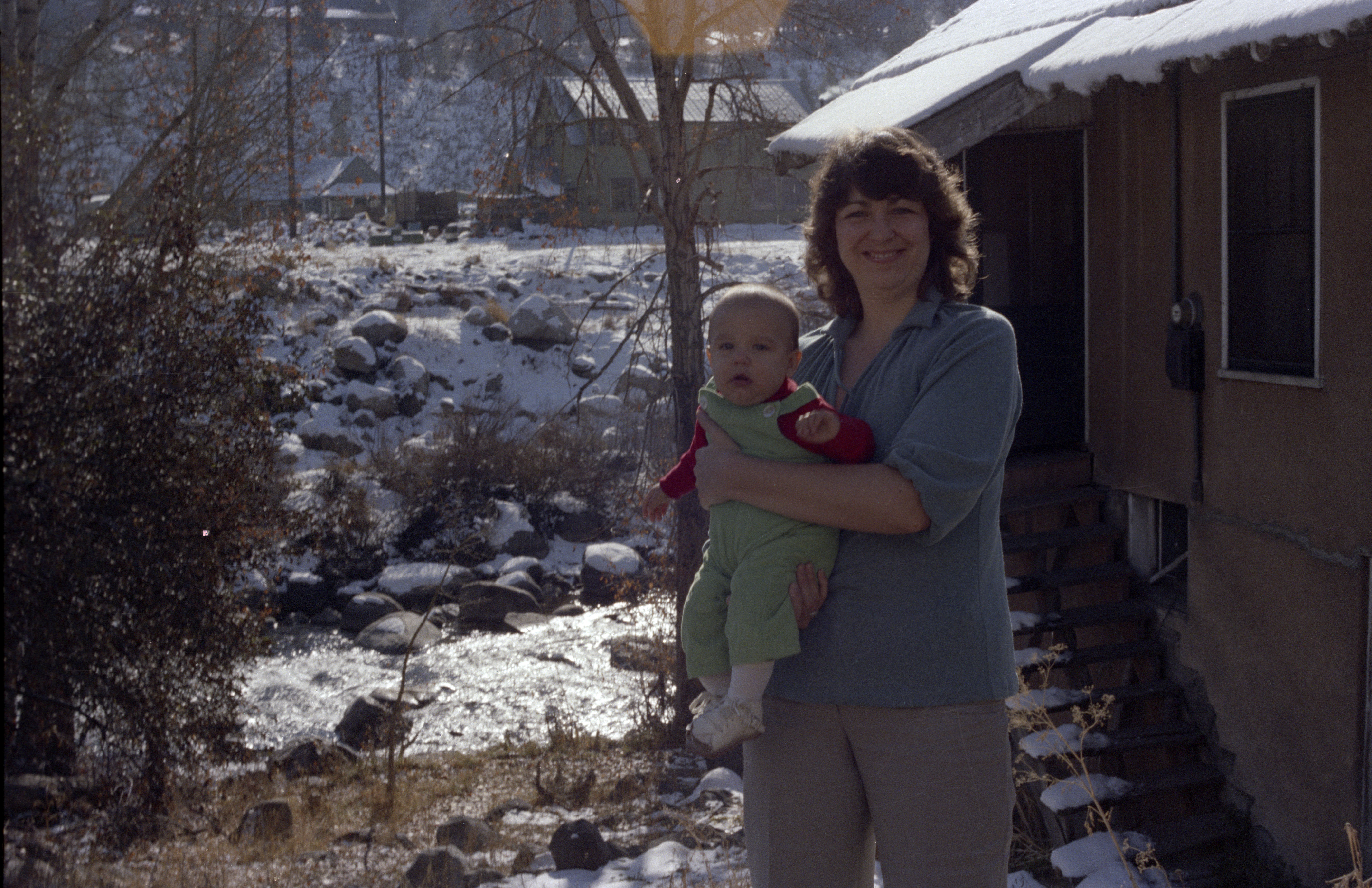 Christine Watkins holding Adam Watkins in front of home where Christine first lived (1949-1951) 10023 Riverside Drive, Truckee, CA