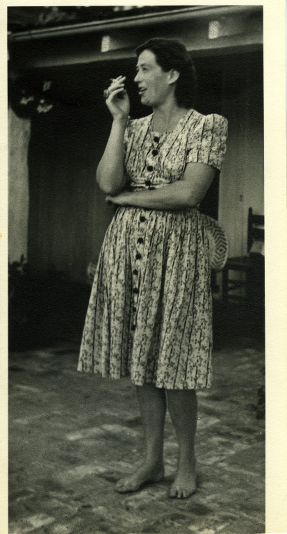 Carol Steinbeck (nee Henning, later Brown) on patio of Brush Road House. The Steinbecks lived here 1938-1941.