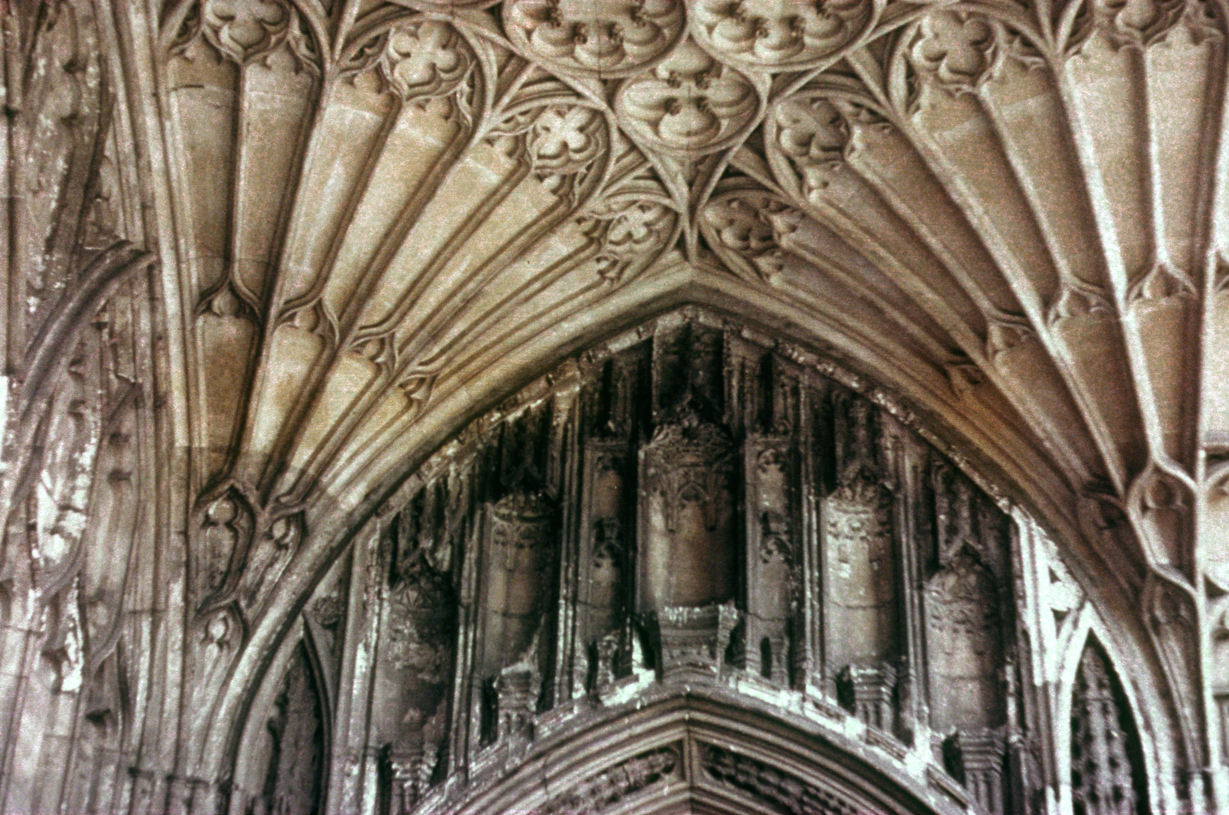 Further developments in vaulting occurred at Gloucester when the cloisters were rebuilt. The Norman Walls Were faced with paneling, new windows were inserted in each bay, and the entire structure was roofed with stone vaulting of new design. Integral ribs were incorporated in the panels which together form a series of inverted cones, or fans, springing from the piers.