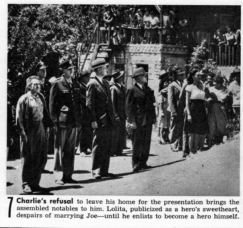 Charlie Martin (J. Carrol Naish) standing with dignitaries near his home in Slough Town just before receiving the Congressional Medal of Honor in his son's stead in Paramount Pictures 1945 production on 'A Medal for Benny.' From left in foreground: Charlie Martin, Governor of California (Edward Fielding), Mayor of Pantera (Grant Mitchell), Lolita Sierra (Dorothy Lamour). This exact shot not in movie.