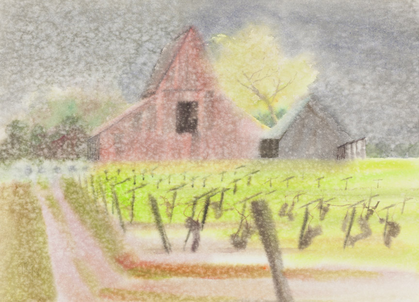 pink rainy barn, green vineyard