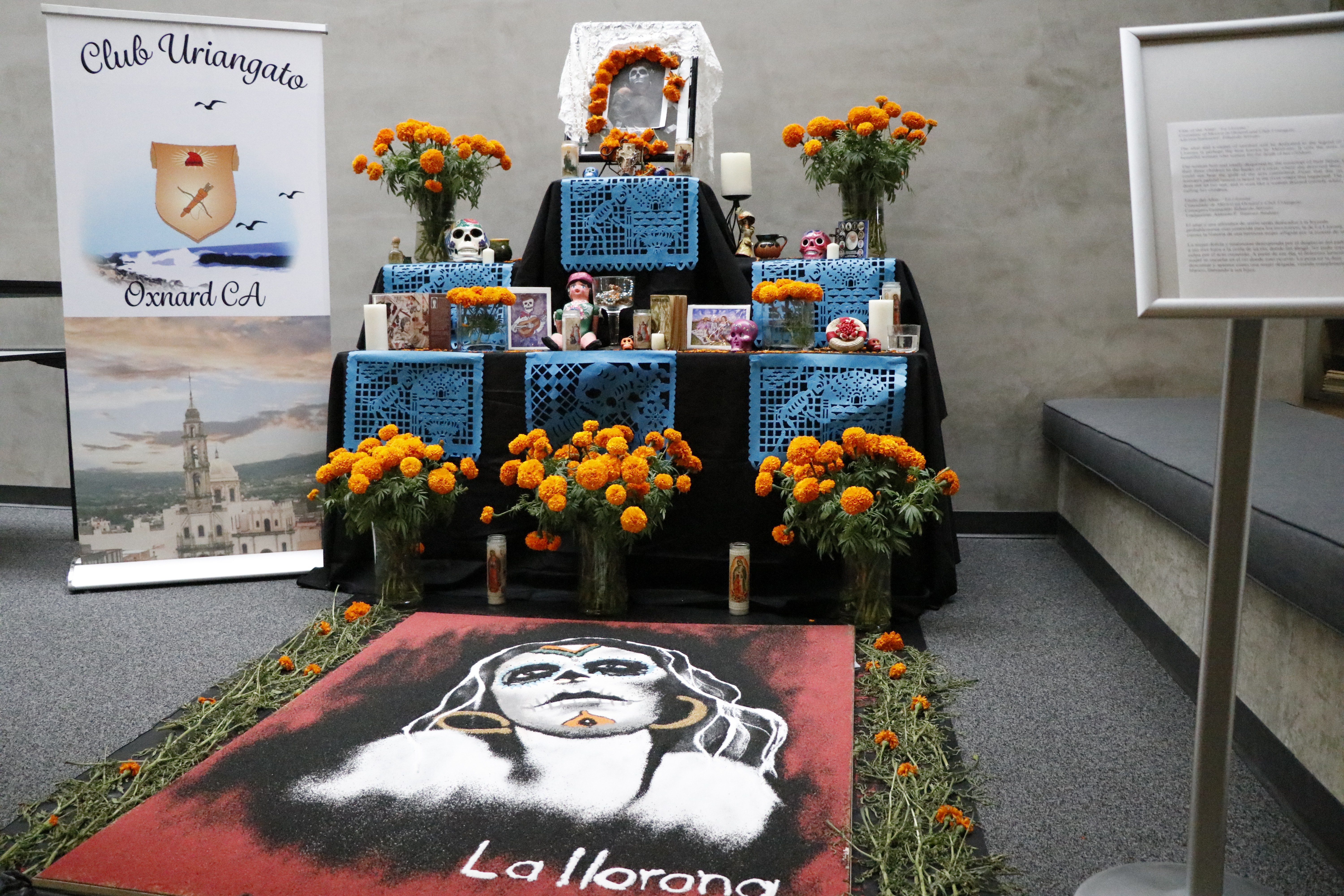 An altar on display in the John Spoor Broome Library for the 2017 Day of the Dead Celebration. Altar by Club Uriangato from Oxnard, CA.