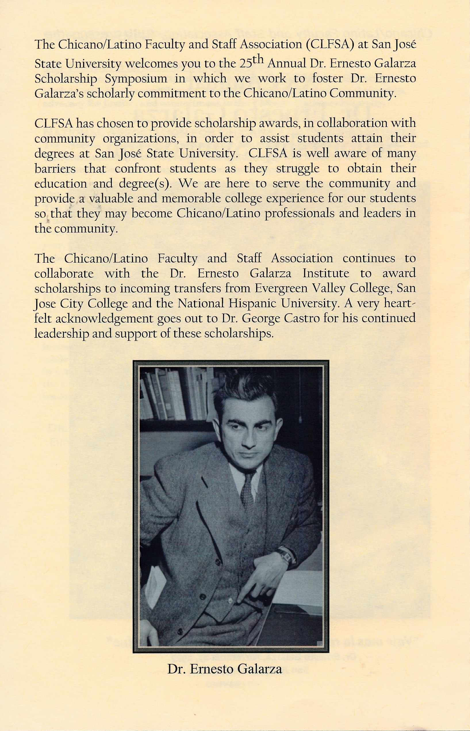 Program for the 25th Annual Dr. Ernesto Galarza Scholarship Symposium, held at San Jose State University on Thursday, May 13, 2010 at 6:00 PM – 8:00 PM in the Dr. Martin Luther King, Jr. Library Cultural Heritage Center. The event included a Registration/Welcome Reception, Welcome by Dr. Julia Curry (President, CLFSA), Presentation of Scholarships by Dr. Magdalena Barrera (Chair, Dr. Ernesto Galarza Scholarship Committee), Keynote Address by Bianca Rivera (Dr. Ernesto Galarza Scholar), Reflections from Past Galarza Scholars by Frank Ortega (2009 – 2010 Dr. Ernesto Galarza Scholar), and Closing Remarks by Dr. Julia Curry and Magdalena Barrera. Seven awards were presented: Dr. Ernesto Galarza Scholarship, National Association for Chicana and Chicano Studies Scholarship, Dr. Ernesto Galarza Institute Scholarship (2 awards), Chicano and Latino Faculty and Staff Association Scholarship (2 awards), and Marisol Perez Memorial Scholarship.