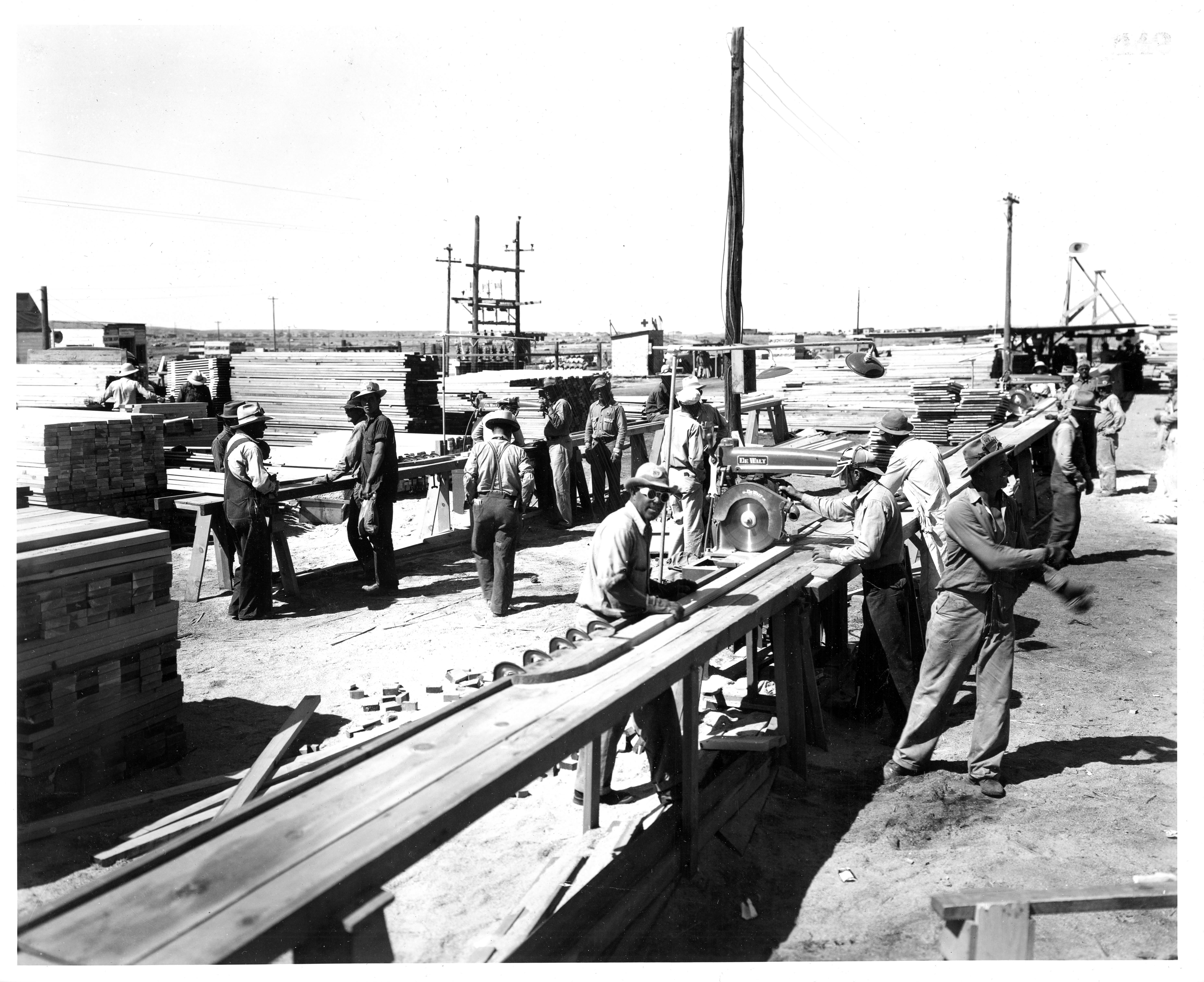 Photograph shows construction operations at Heart Mountain Relocation Center near Cody, Wyoming.