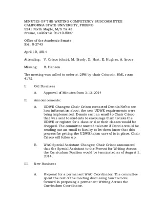 Minutes of the Writing Competency Subcommittee 04/10/2014