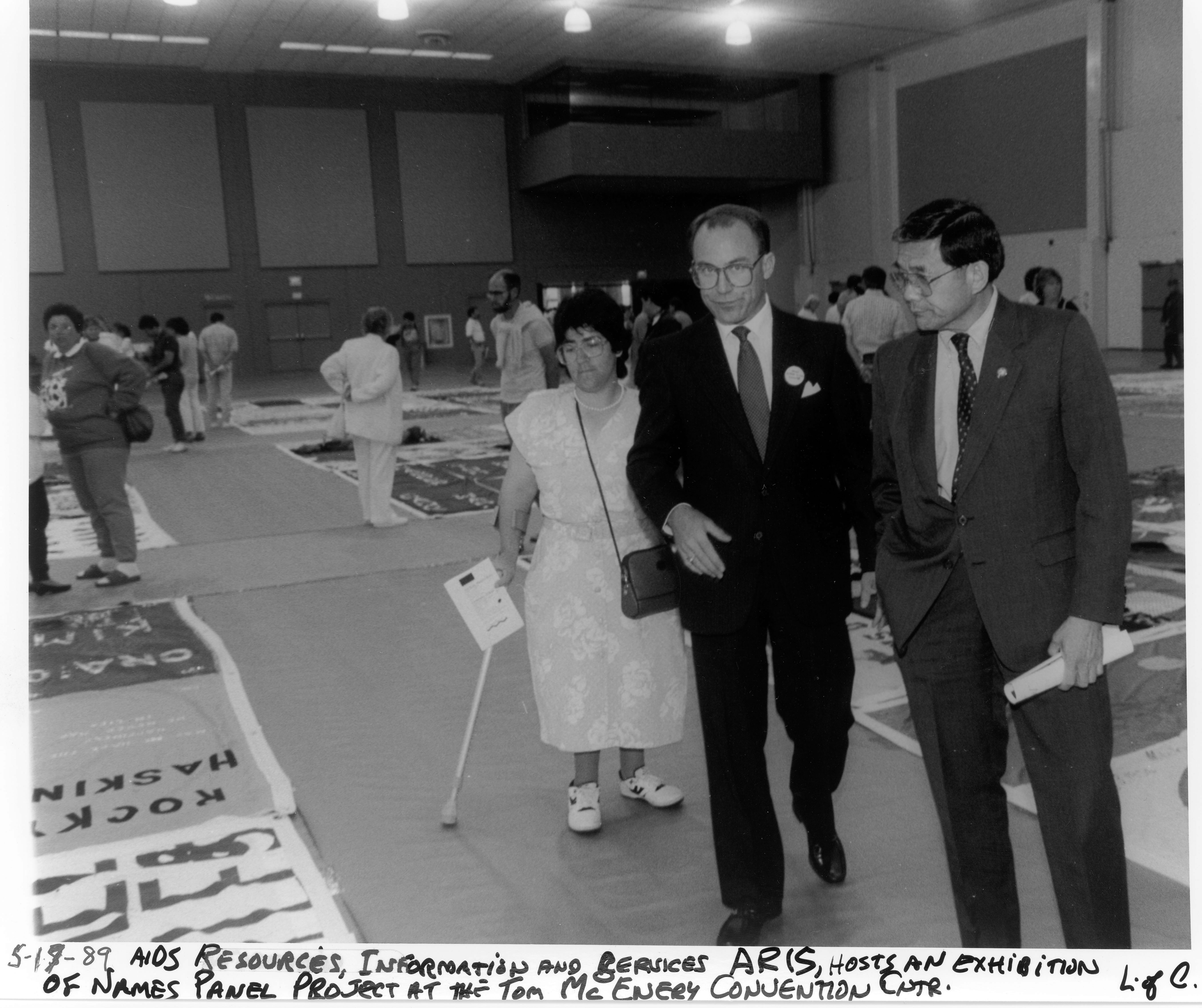Photograph shows Norman Mineta (right) with two other individuals viewing the AIDS quilts on display at the Tom McEnery Convention Center. The exhibition of the the quilt was hosted by the AIDS Resources, Information and Services (ARIS) Project.
