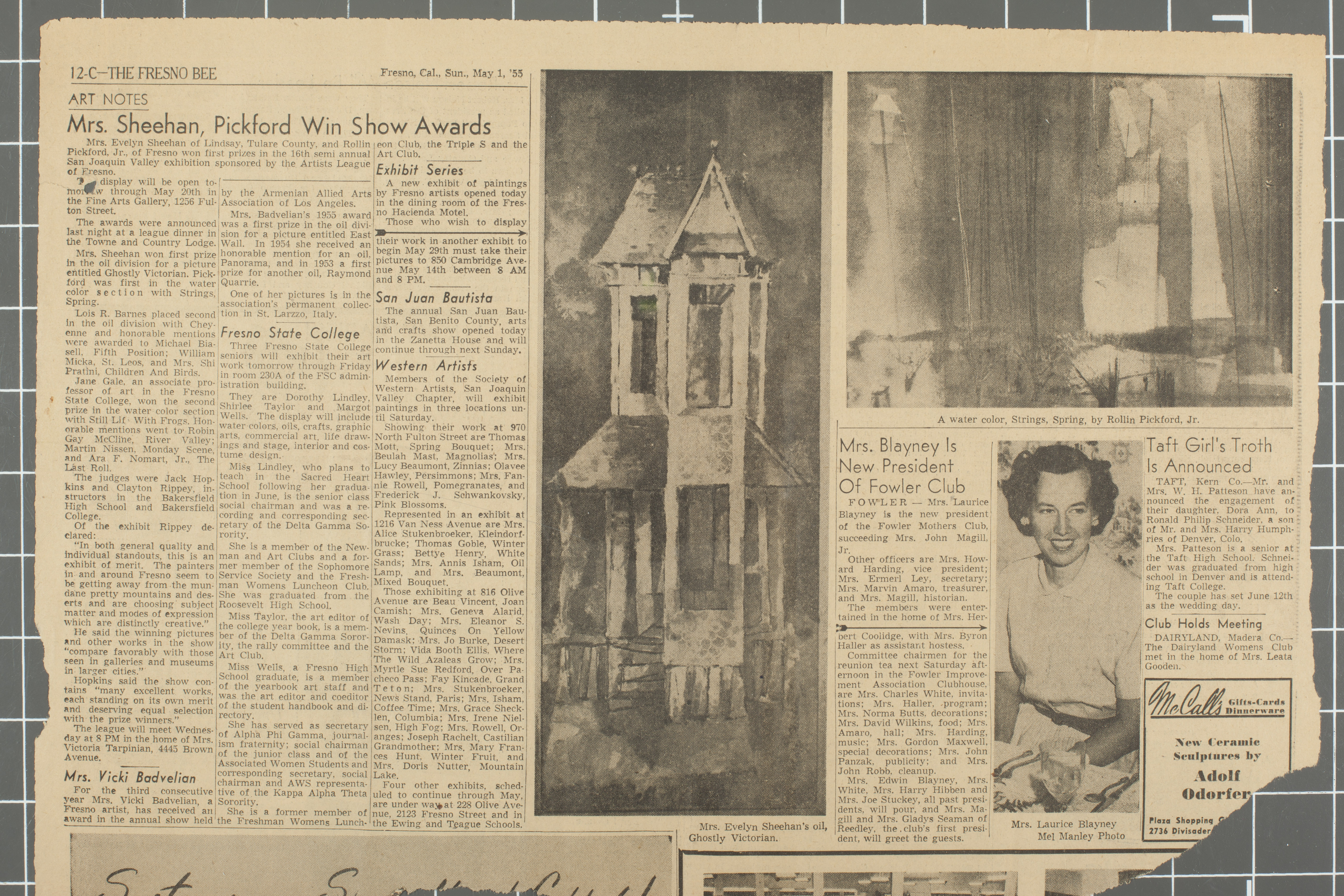 Article details awards by Fresno artists Including Rollin Pickford with one watercolor by Rollin Pickford.
