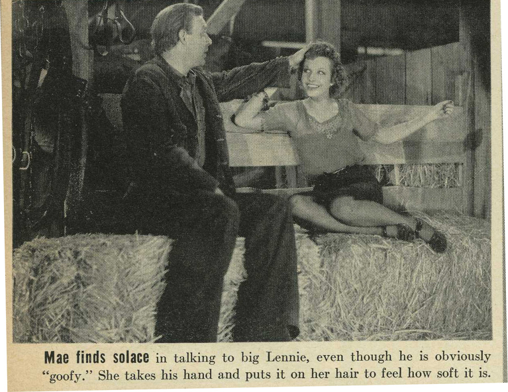 Of Mice and Men movie still. Lennie (Lon Chaney Jr.) petting Curley's wife's hair, (Betty Field). Mae, the name for Curley's wife, was added for the film. In the book Curley's wife is not named.