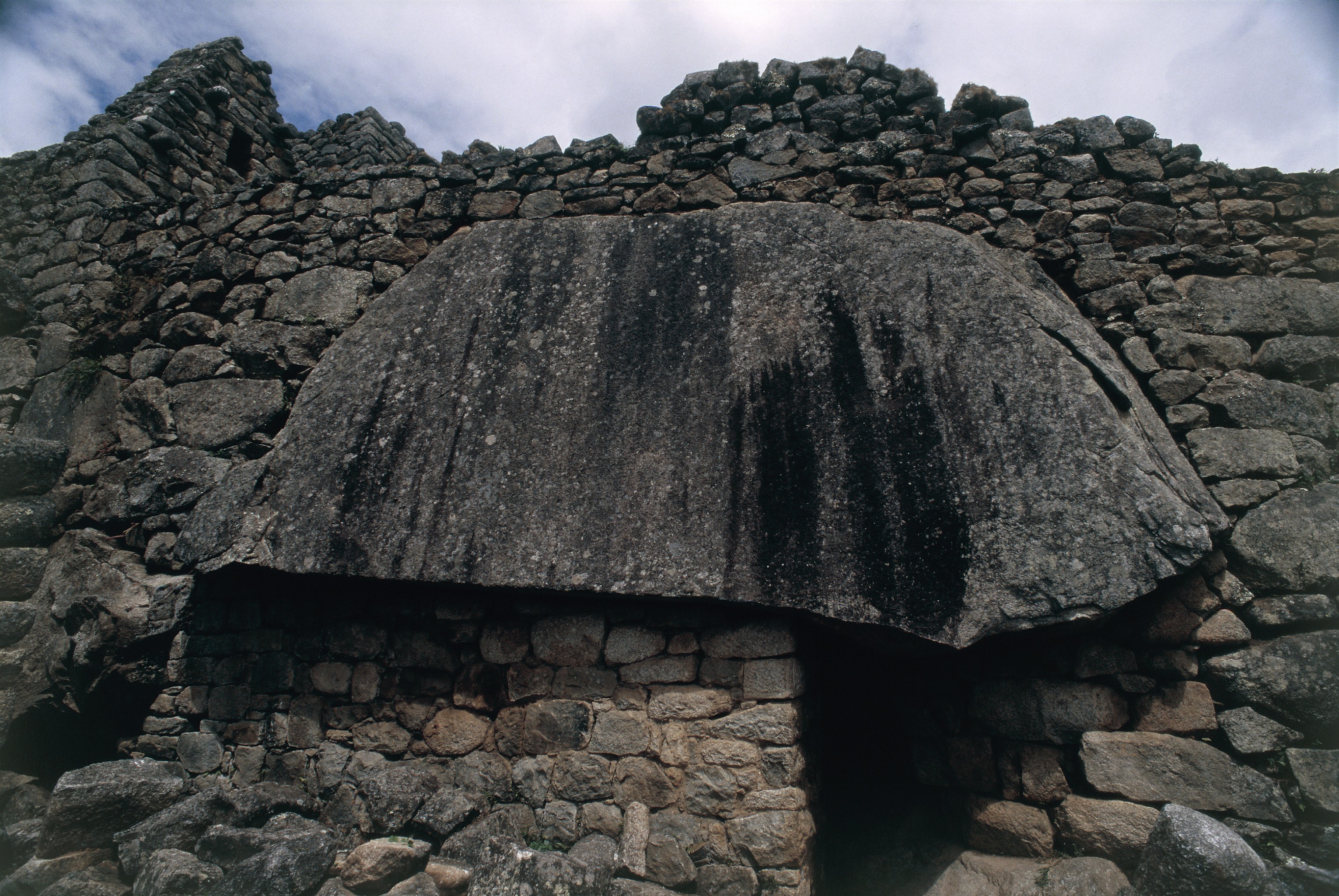 Conjunto I: huge natural stone protects the masonry of small shelter, example of Incan sense of harmony in using the natural with the man made