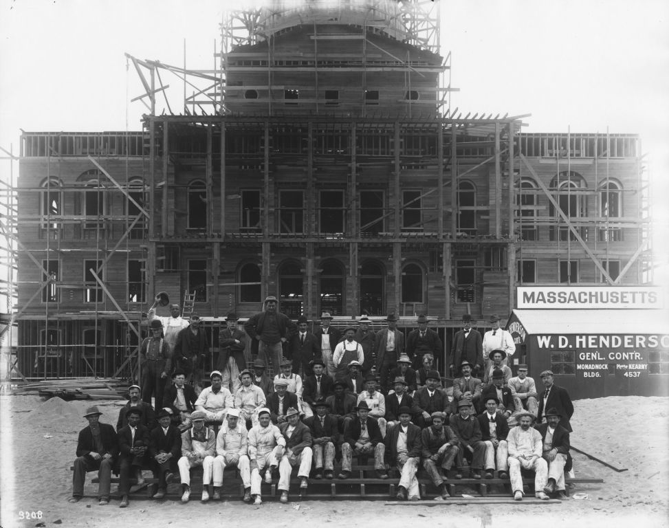 Front of Massachusetts State Building under construction and group of workmen in foreground