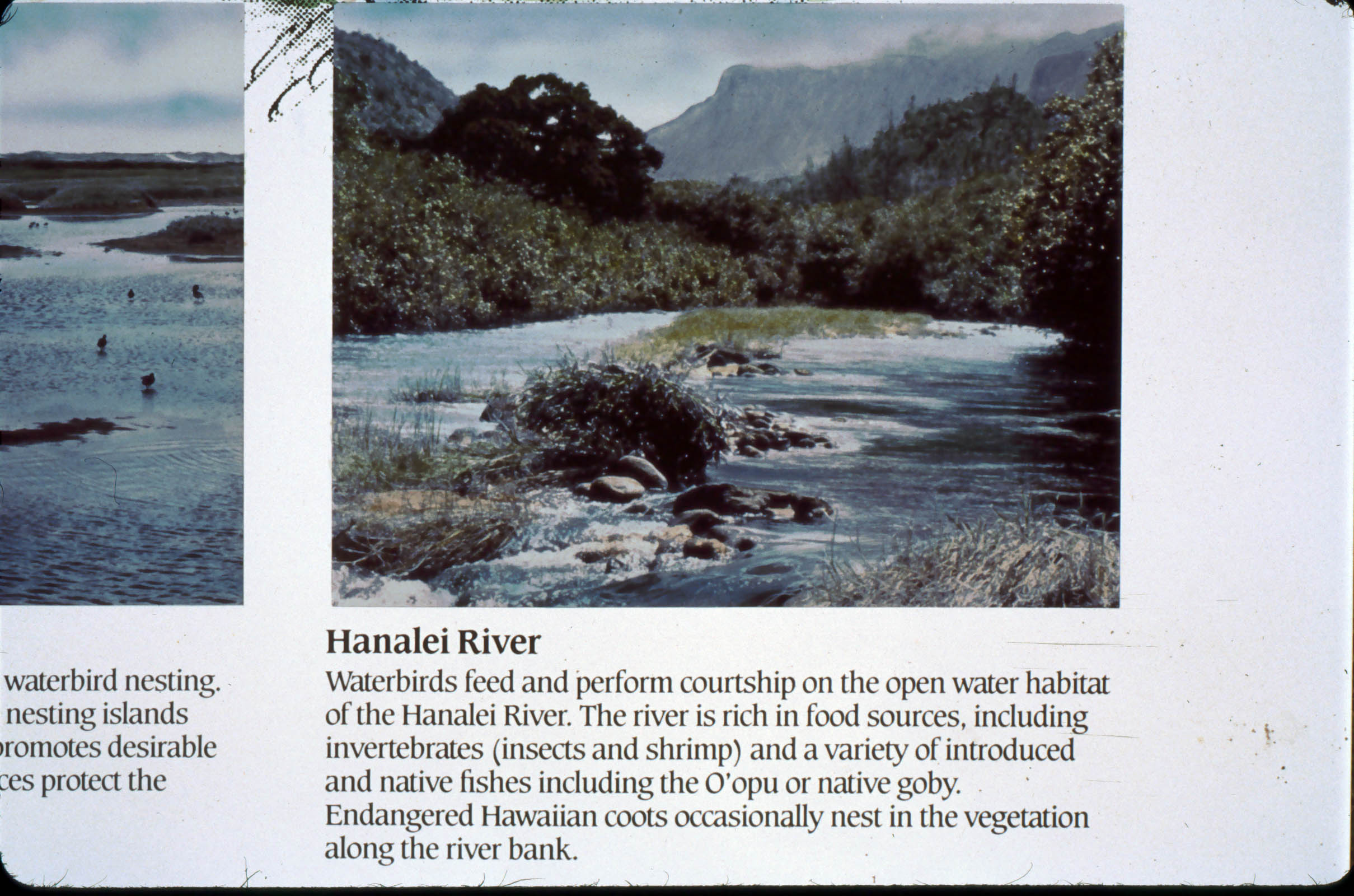 Sign: "Hanalei River: Waterbirds feed and preform courtship on the open water habitat of the Hanalei River. The river is rich in food sources, including invertebrates (insects and shrimp) and a variety of introduced and native fishes including O'opu or native goby. Endangered Hawaiian coots occasionally nest in the vegetation along the river bank.