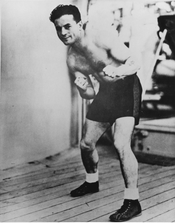 Ratzi (Tiny) Colletto portrait in boxing shorts and standing in a boxing pose. The inscription on the back: 'Navy...Champion in weight.