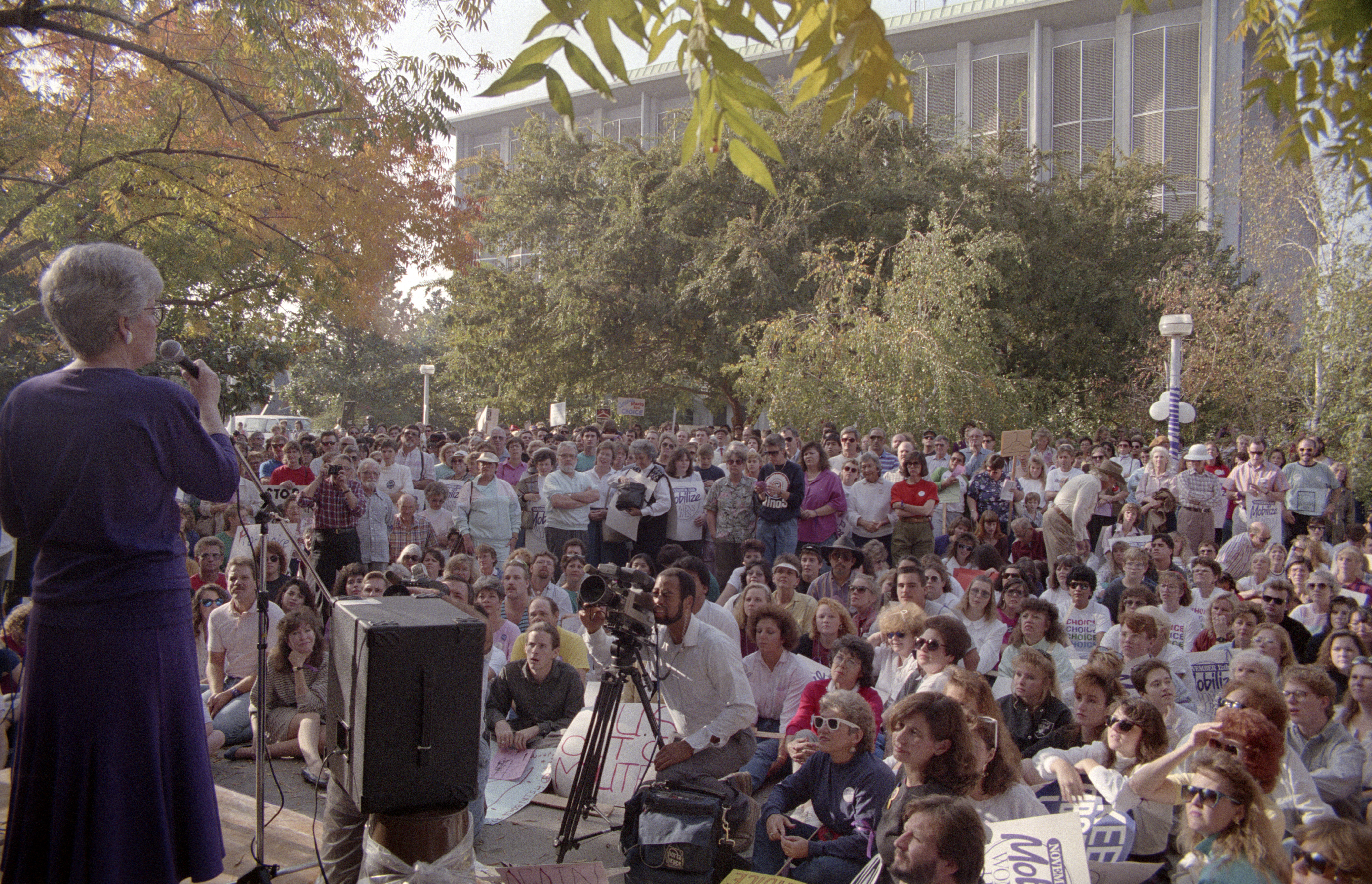 Backside of Lori Foster speaking at microphone with media and front crowd seated and others standing and overflowing plaza area