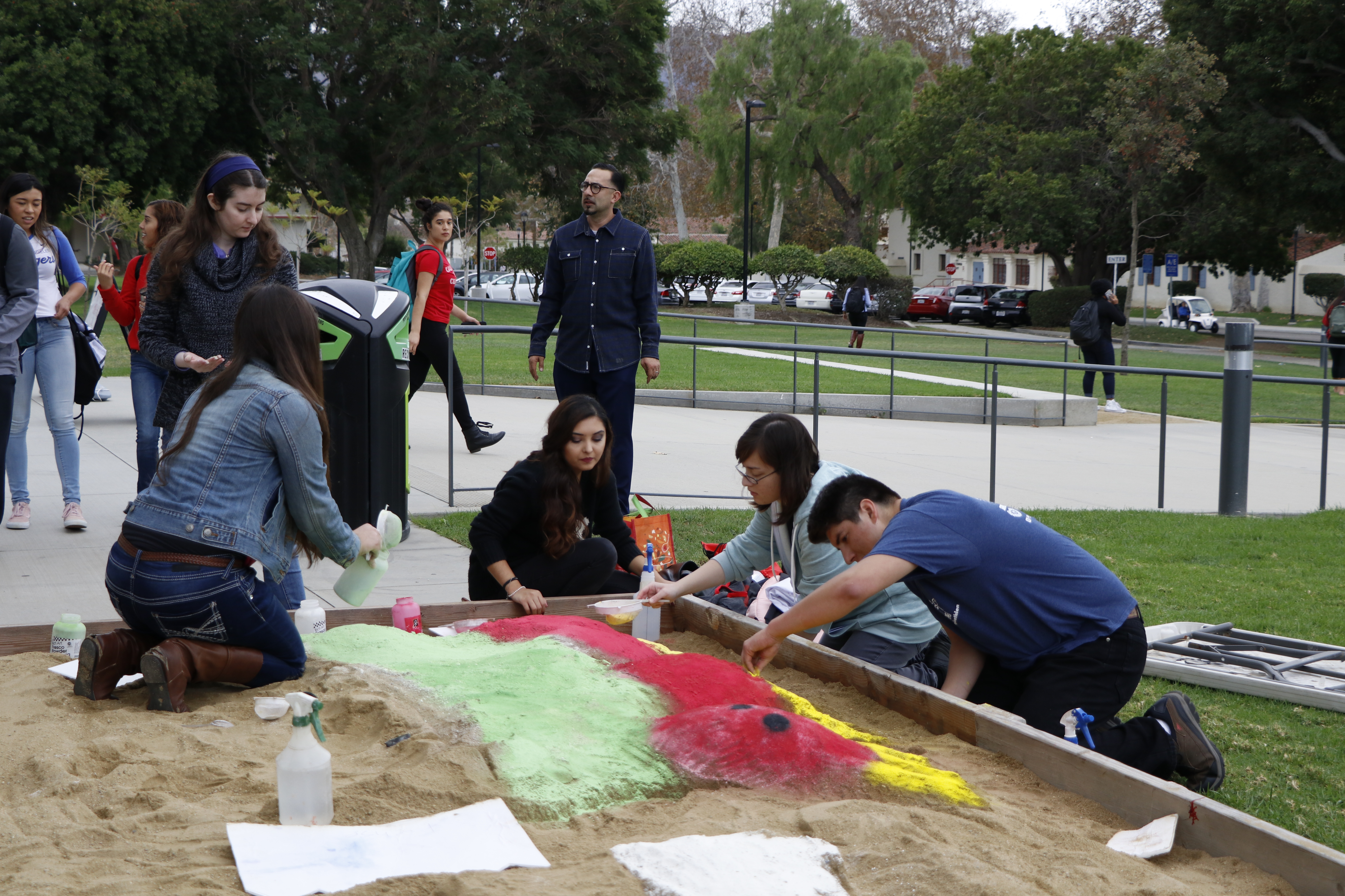 CI students help Chicano artist, Leo Limon, create a sand sculpture for the 2017 Day of the Dead Celebration at the John Spoor Broome Library.