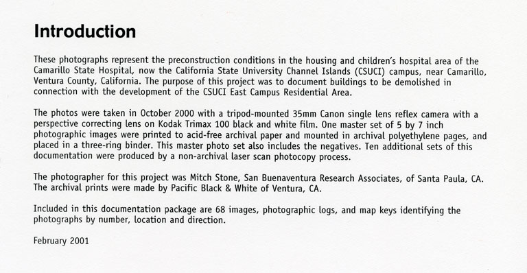 Explanation of Photographs Taken After ClosingCamarillo State Hospital (1936-1997)
