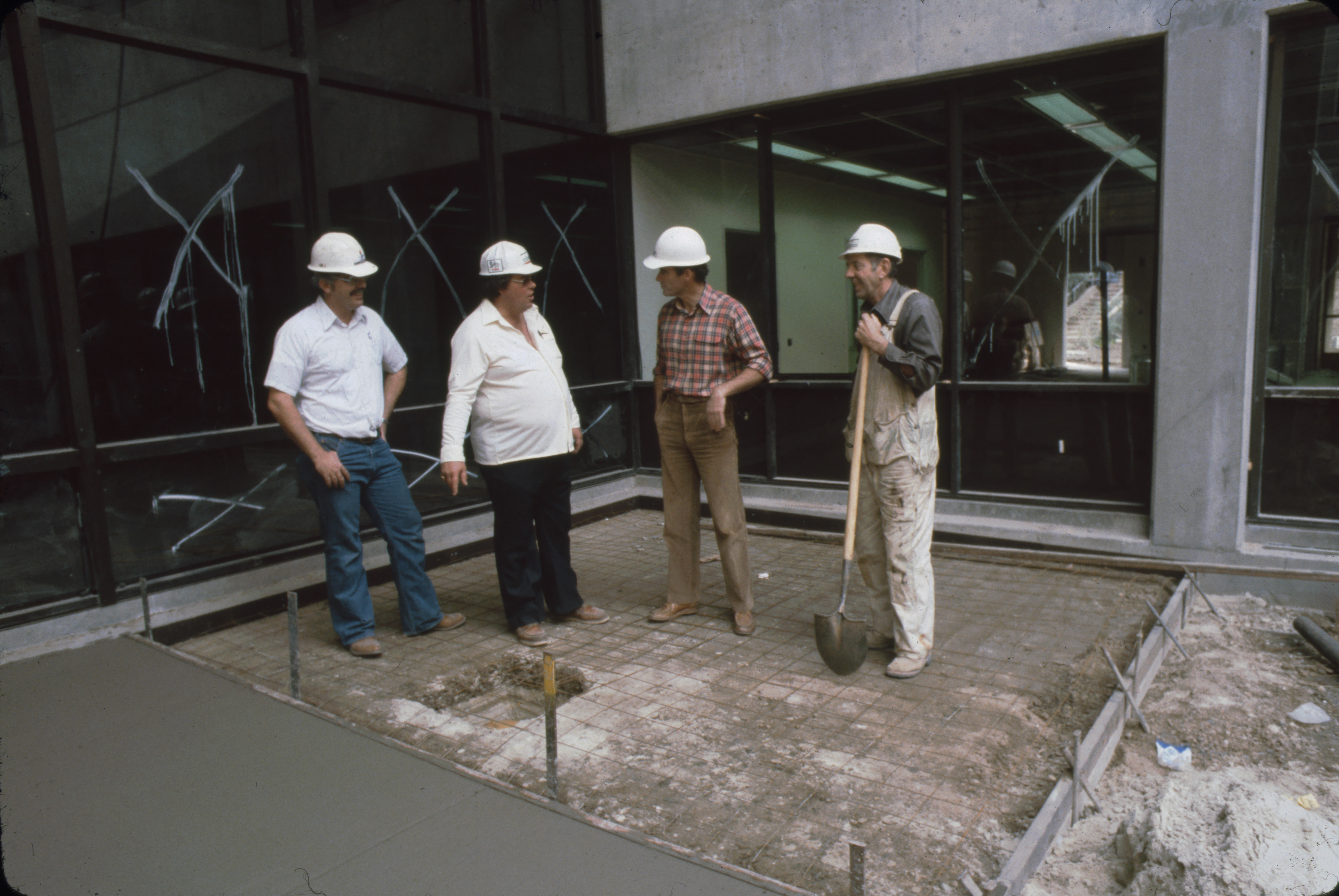 Construction workers conversing over the building of the atrium inside Kennedy Library. Four workers in hard hats are standing inside the atrium, all wearing hard hats and one holding a shovel. Large "x"'s are painted on the windows behind them.