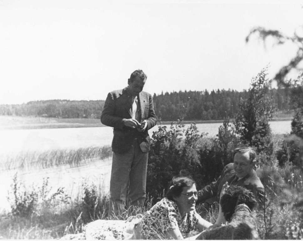 John and Carol Steinbeck and an unknown man beside a pond. See also numbers. 0-384, 1-385, 1-813, 1-814, 1-815.