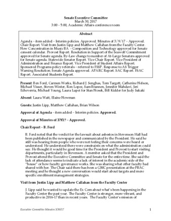 Agenda – item added – Interim policies. Approved. Minutes of 3/9/17 – Approved. Chair Report. Visit from Justin Lipp and Matthew Callahan from the Faculty Center. New Concentration in Music BA - Composition and Technology approved for Senate consent calendar. Provost Report. Resolution in Support of the Seawolf Commitment approved for Senate agenda. By-Law change to number of At-Large Senators approved for Senate agenda. Statewide Senator Report. Vice Chair Report. Vice President of Administration and Finance Report. Vice President of Student Affairs Report. Sponsored Programs policy referrals – referred to FSSP. Response to AS Trigger Warning Resolution. Senate Agenda approved. APARC Report. SAC Report. FSAC Report. Associated Students Report.