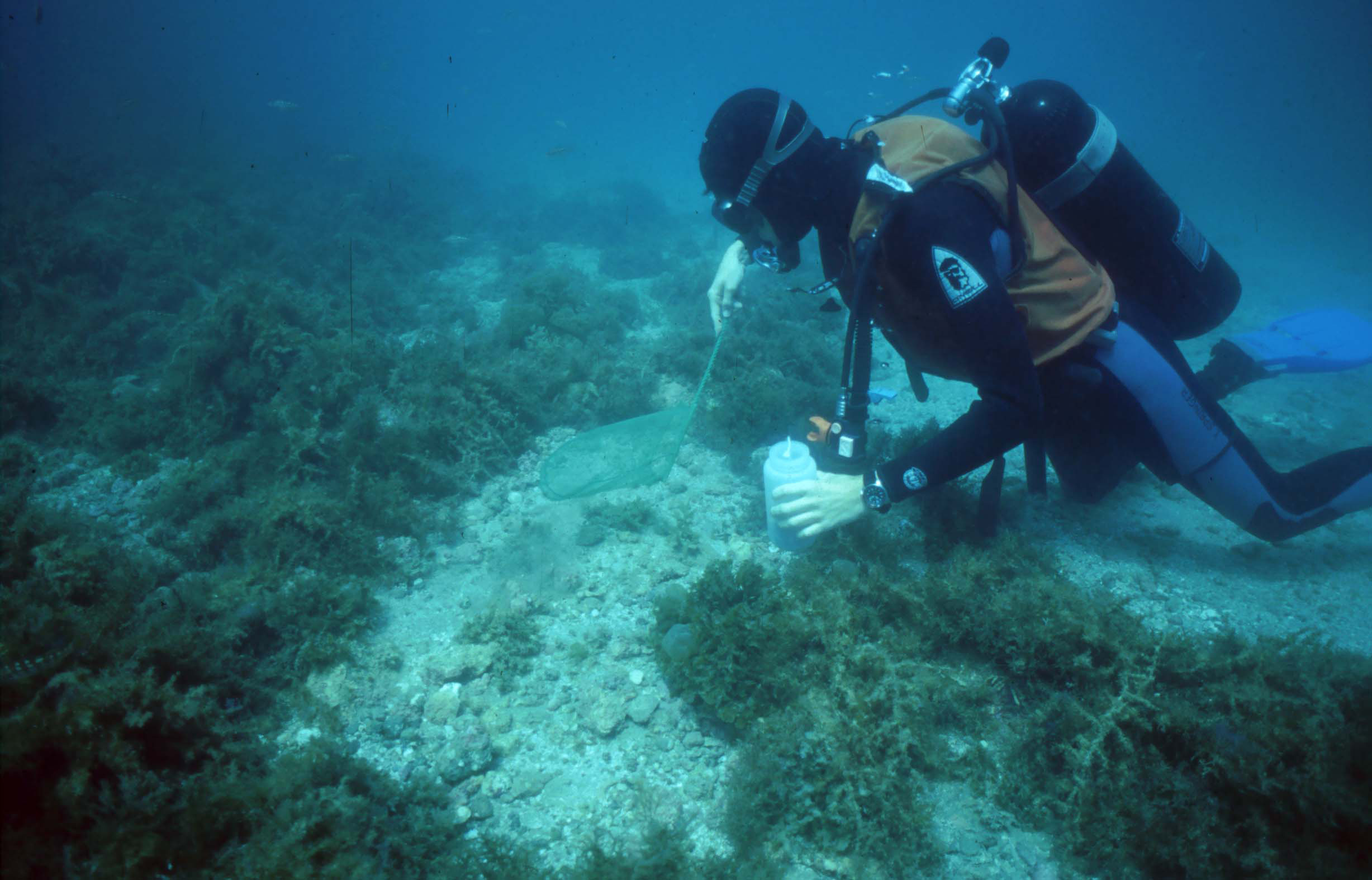 Yuri Springer collecting Coryphopterus with hand net and collection bottle