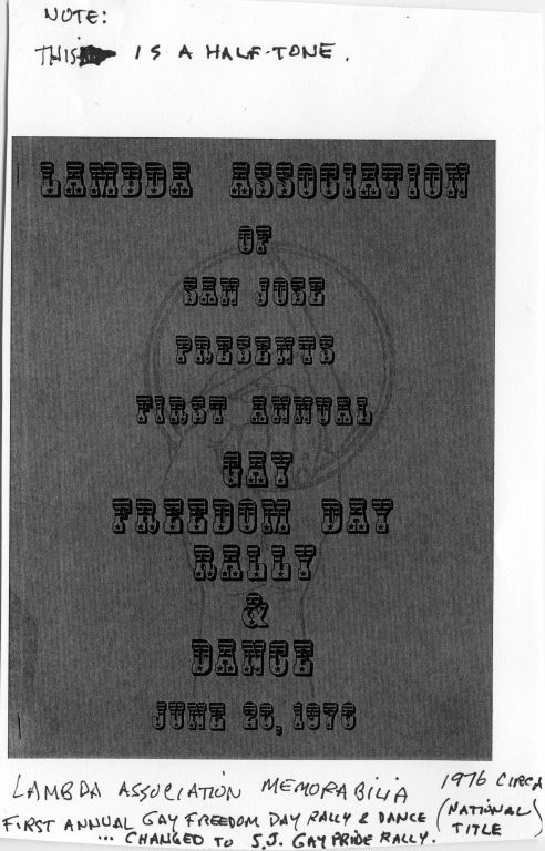 Small black and white photocopy of the Lambda Association of San Jose's logo for the First Annual Freedom Day Rally & Dance held June 26, 1976. The Lambda Association image appears in background.