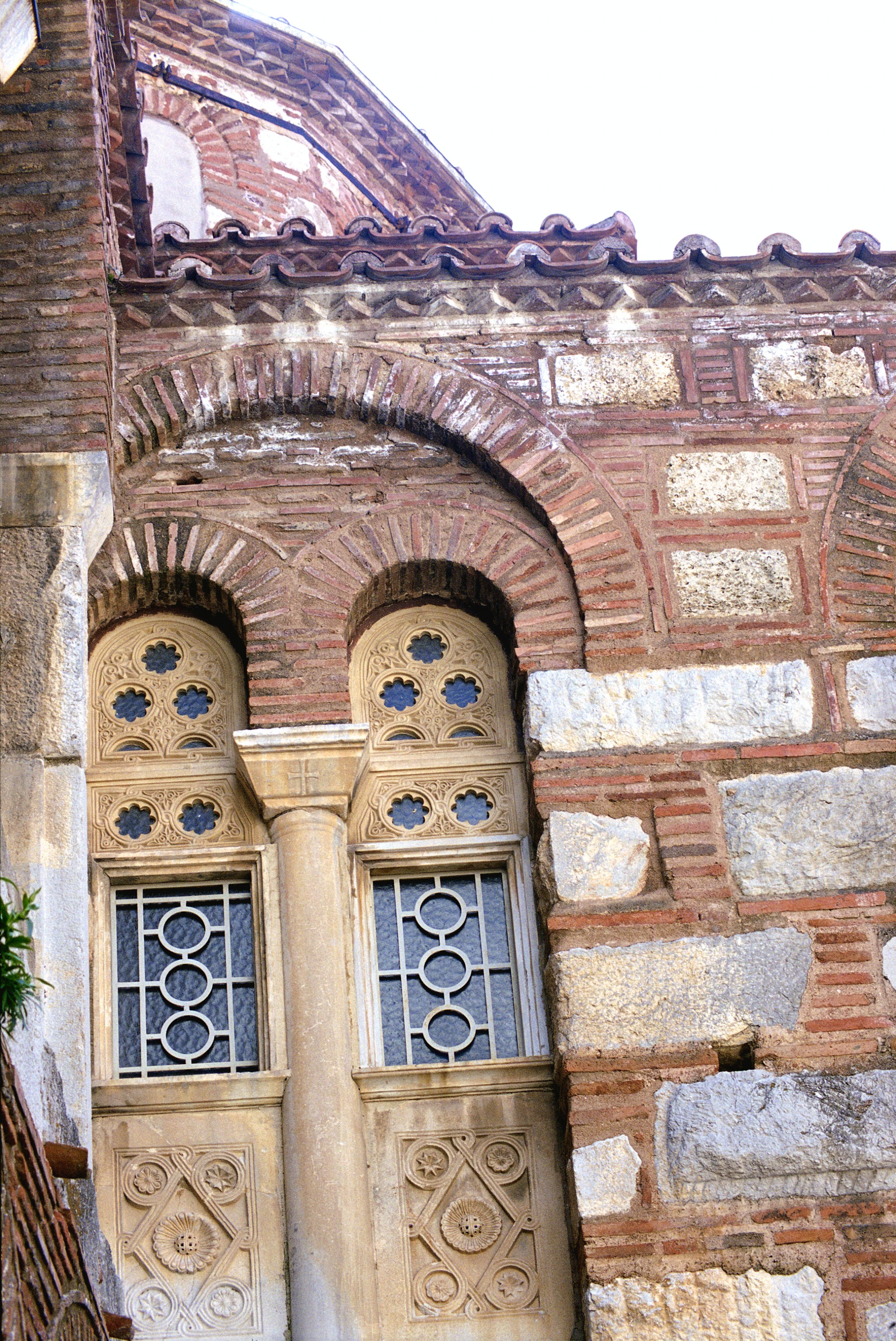 Katholikon N flank: upper window abutting exo-narthex arcade of Theotokos, from N