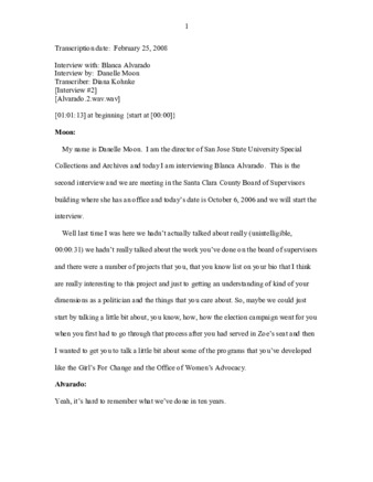 - Transcript two: October 6, 2006 interview with Blanca Alvarado by Danelle Moon (then Director of SJSU Special Collections & Archives), as part of the South Bay Second Wave Feminist Oral History Project.