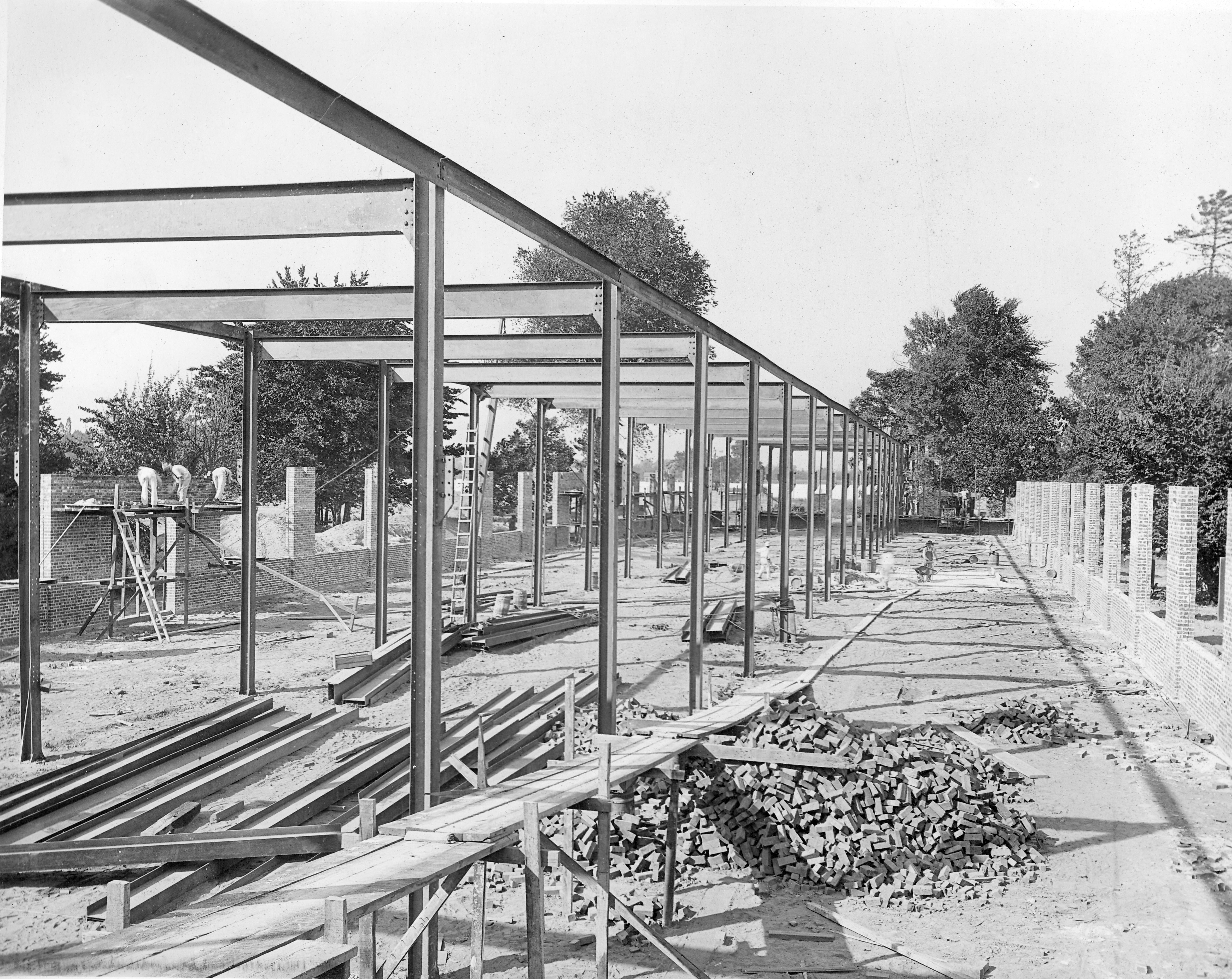 Construction workers laying bricks at a construction site. Public