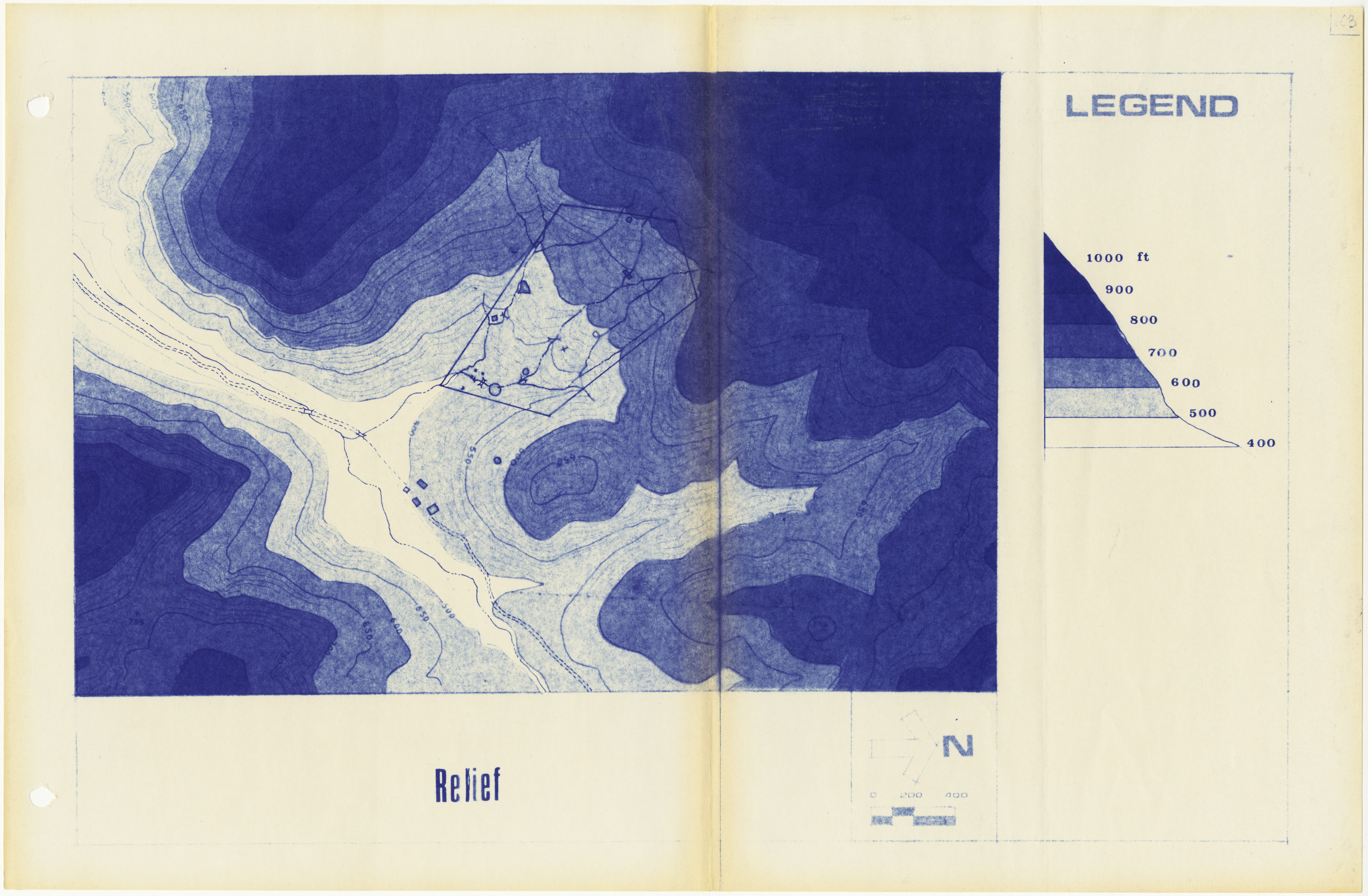 Topographic map, with colored shading indicating the grade of Poly Canyon between the elevations of 1,000 feet and 400 feet. Page 103 of the report.