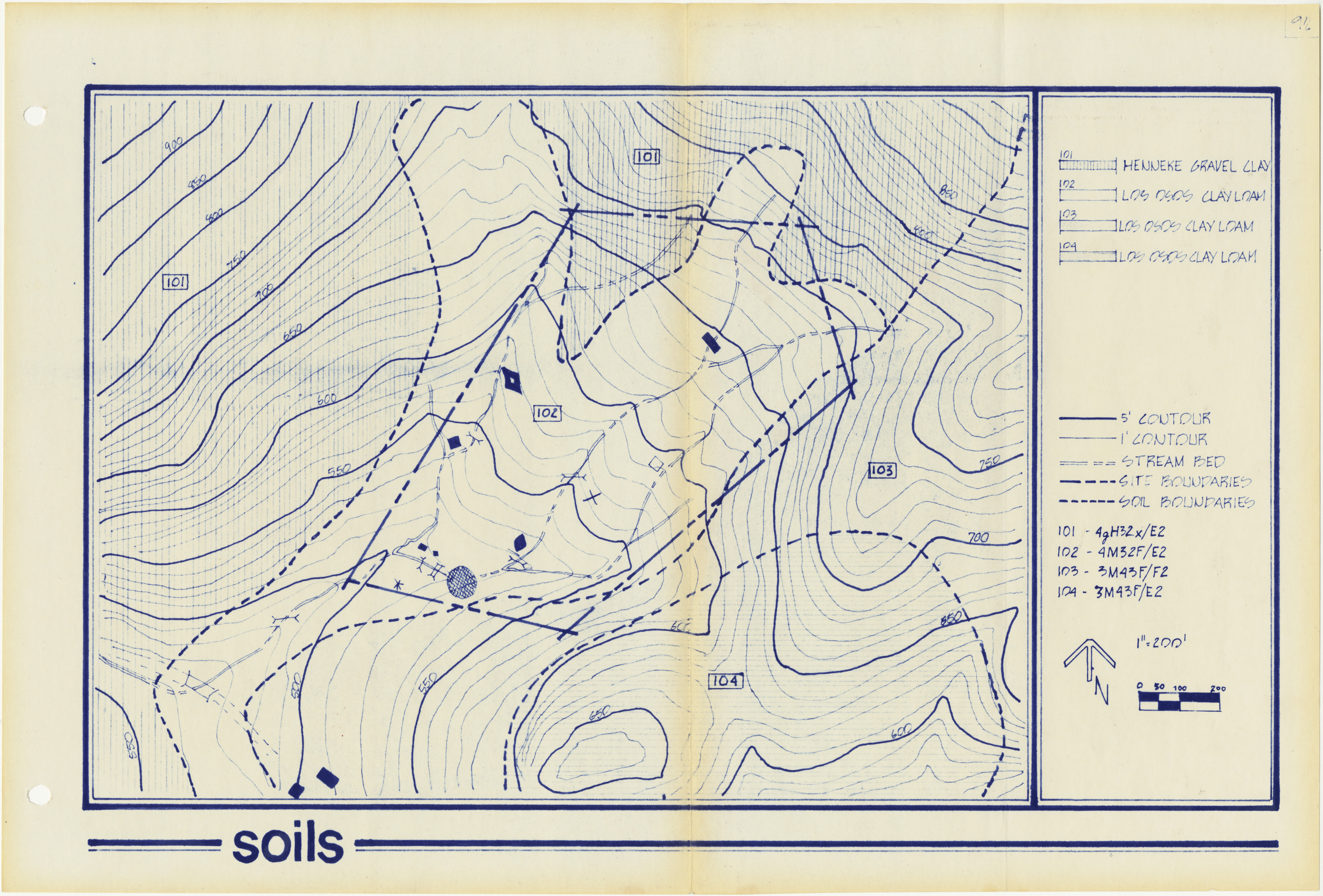 Topographic map depicting areas with Henneke gravel clay and Los Osos clay loam. The map also includes symbols showing 5' countour lines in the topography, as well as 1' contour lines, stream beds, site boundaries, and soil boundaries. Page 92 of the report.